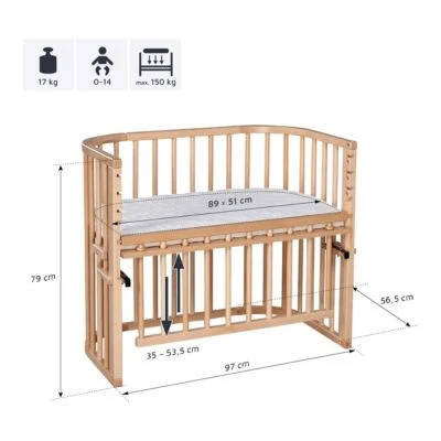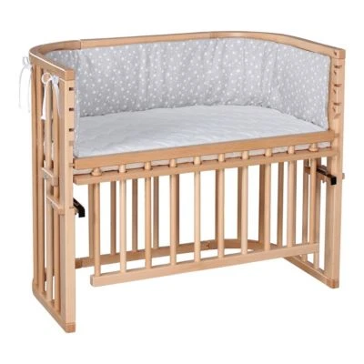 Einzelner Nachwuchs oder Babys im Doppelpack – im babybay Maxi Beistellbett finden sie reichlich Platz. Comfort Plus: Das integrierte, verstellbare Verschlussgitter bietet noch mehr Sicherheit. Neue, justierbare Befestigungswinkel machen die Montage am Elternbett werkzeuglos möglich. Lieferumfang: Beistellbett babybay Maxi Comfort Plus, Verschlussgitter, höhenverstellbare Liegefläche Material: massive, heimische Buche Verwendung: Beistellbett, Kinderbank, Stubenwagen, Reisebett, Schreibtisch, Spieltisch, Puppenwickeltisch, Hochstuhl, Kinderstuhl (teilweise separates Zubehör erforderlich) Belastbarkeit: bis 150 kg (0-14 Monate) Maße: stufenlos verstellbar ab Boden 36-53,5 cm, Liegefläche 89 x 51 cm, Standfläche 94 x 52 cm, Gesamthöhe 79 cm Einfache Befestigung: Mit den justierbaren Befestigungswinkeln lässt sich das Beistellbett ganz ohne Werkzeug sicher am Elternbett befestigen. Die Winkel lassen sich direkt am Bett von oben und von unten verstellen, egal bei welchem Bettrahmen. Das Entfernen geht genauso einfach. Die Liegefläche ist stufenlos in der Höhe verstellbar. So passt sie sich an jede Betthöhe an, ganz ohne Stufe oder Spalt. Sicher: Das mitgelieferte Verschlussgitter ist höhenverstellbar – es lässt sich mit einem Handgriff in fünf Stufen ausfahren und absenken. So schützt es den Nachwuchs zuverlässig vor dem Herausrollen, wenn das Bett als freistehendes Säuglingsbett bzw. Stubenwagen verwendet wird. Die Liegefläche ist mit einer Belüftung versehen, sodass stets eine optimale Luftzirkulation gewährleistet ist. Gefertigt ist babybay Maxi Comfort Plus aus natürlichem Buchenvollholz. Dieses stammt aus europäischen, nachhaltig bewirtschafteten Wäldern und kommt ohne bedenkliches Leimholz oder günstige Holzersatzstoffe aus. Angenehmes Plus: Das Holz ist von Natur aus antibakteriell und antistatisch. Wächst mit: Zusätzlich überzeugen bei diesem Bett seine vielseitigen Nutzungsmöglichkeiten. Mit ihnen begleitet das Bett die Familie noch über viele Jahre – ob als Schreibtisch, Sitzbank, Puppenwickeltisch, Spieltisch oder Kinderstuhl. Hinweise Nestchen und Matratze sind nicht im Lieferumfang enthalten. Bitte separat bestellen. Mit dem optional erhältlichen Befestigungsset inklusive Gurt kann das babybay Maxi Comfort Plus auch an Betten ohne Rahmen befestigt werden.