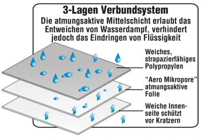 Äußere Schicht: Das äußerst strapazierfähige Polypropylen ist sowohl UV-beständig, als auch wasserabweisend und besticht zudem durch seine Langlebigkeit. Mittlere Schicht: Die atmungsaktive mittlere Membran „Aero Mikropore“ erlaubt das Entweichen von Wasserdampf um somit gegen Schimmelbildung vorzubeugen. Innere Schicht: Dank der besonders weichen Polypropylen-Folie in der Innenseite wird Ihr Fahrzeug vor Kratzern geschützt.