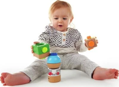 Die vier interaktiven Klötze sind aus einem Mix aus hochwertigen Materialien gefertigt und werden Kinder mit ihren tollen Funktionen begeistern! Die Rassel und der Quietscher laden vor allem zum auditiven Entdecken und Zuhören ein. Der grüne Klotz ist besonders spannend in der taktilen Erfahrung. Und der rote Klotz trainiert mit seinen Labyrinth-Kügelchen das Verständnis von Ursache und Wirkung. Für spannende Spielstunden voller Entdeckungen!