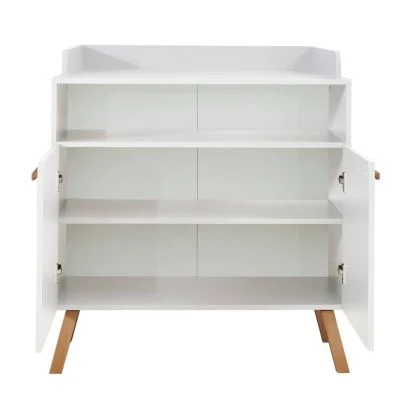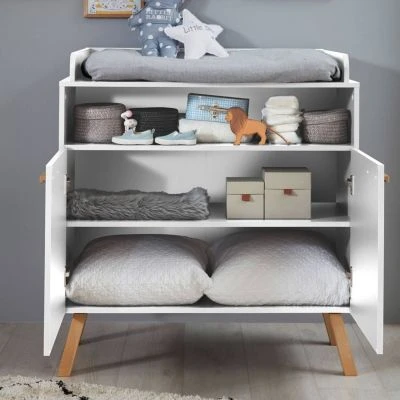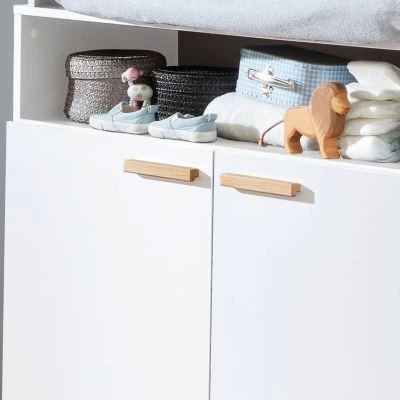 1 Wickelkommode mit 1 Wickelaufsatz, abnehmbar, inkl. 2 Abdeckkappen, 2 Türen, 1 verstellbarer Einlegeboden, 1 offenes Fach, maximale Belastbarkeit 15 kg, B/H/T: ca. 95/105/78 cm