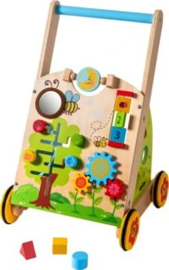 Und los geht’s! Der niedliche „Lauflernwagen Holz“ von myToys ist ein toller und funktionaler Spielebegleiter bei den ersten Schritten. Mit einer Schubhöhe von fast 50 cm und dem blauen Schiebegriff hat der Wagen die perfekte Größe für kleine Fußgänger. Gummibeschichtete Räder sorgen für Stabilität und hindern den Wagen am Wegrutschen. Im Fach auf der Rückseite ist Platz für die bunten Steckförmchen (Dreieck, Kreis und Quadrat), außerdem bietet es eine prima Mitfahrgelegenheit für den Lieblingsteddy! Für die Pausen zwischen den Spaziergängen ist das Spielboard wunderbar geeignet. Es punktet im liebevoll-bunten Design mit verschiedenen Spielmöglichkeiten, wie Drehen, Schieben, Guck-Guck-Spiele und Förmchen sortieren. Außerdem können die Zahnräder und der Spiegel gedreht und die Türen auf- und zugeklappt werden. Der Lauflernwagen fördert die motorischen und koordinatorischen Fähigkeiten und sorgt für tolle Spielemomente.
