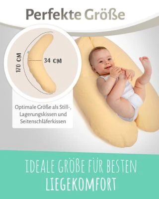 Das Inlett ist mit einem Reißverschluss versehen, sodass die Menge der Füllung individuell angepasst und der Bezug problemlos gewaschen werden kann. So kann eine möglichst lange Nutzungsdauer bei entsprechender Pflege garantiert werden und das Kissen vielleicht auch noch dem nächsten Kind eine Unterstützung in der ersten Lebensphase sein.
