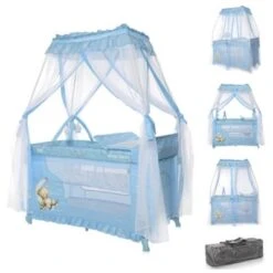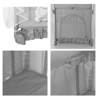 Reisebett, Laufstall und Babybett in einem zwei Ebenen zum Ausruhen und Spielen Faltmatratze auf kompakte Größe faltbar Mobile Wickelauflage seitliche Öffnung mit Reißverschluss außen zweite Ebene mit Reißverschluss Räder für einfaches Bewegen doppeltes Sicherheitsfaltsystem einfach für den Transport Baldachin als Betthimmel mit Halter praktische Tragetasche im Lieferumfang