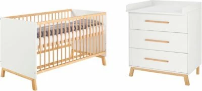 Das Spar-Set „Venice“ aus dem Hause Schardt bildet eine hervorragende Basis für die Einrichtung des Babyzimmers. Das Kombi-Kinderbett begleitet Familien von Geburt an und kann danach lange genutzt werden. Je nach Alter des Kindes lässt sich die Höhe der Liegefläche anpassen. So kann das Baby anfangs rückenschonend aus dem Bett gehoben werden. Wenn das Kind sitzen oder stehen kann, wird der Lattenrost auf eine niedrigere Höhe gebracht. Drei Schlupfstäbe ermöglichen dem Kind ein selbstständiges Herausklettern aus dem Bett.