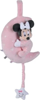 Es ist Schlafenszeit! Und wer schaukelt da so friedlich über dem Bettchen? Minnie Maus hat auch schon ihren flauschigen Strampler angezogen und kuschelt sich ganz fest an den Mond. Mit dieser bezaubernden Disney Minnie „Glow in the Dark Spieluhr Mond“ von Simba kommt ein flauschiger Einschlafbegleiter mit vielen kleinen Elementen, die im Dunklen leuchten. Wenn man an dem kleinen Stern zieht, spielt die Spieluhr ein Einschlaflied und wird damit auch schon die Kleinsten verzaubern.