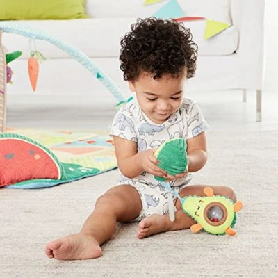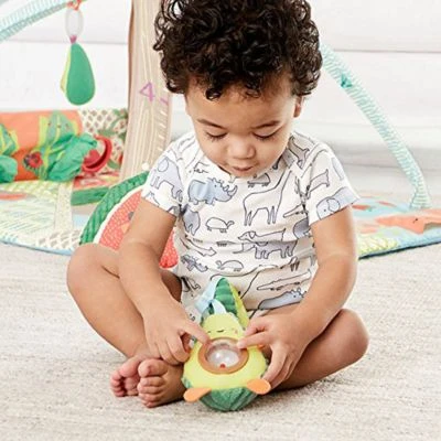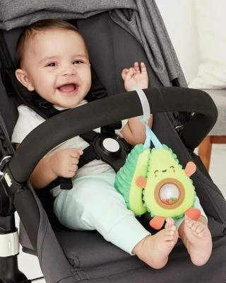 Die absolut unwiderstehliche Avocado von Skip Hop besteht aus zwei aneinander haftenden Hälften. Kleine Kinderhände können das Spielzeug einfach greifen und die Hälften auseinanderziehen. Im Inneren befindet sich (als kleine Überraschung) ein durchsichtiger “Kern” mit Rasselkugeln für die auditive Wahrnehmung. Die plüschige, texturierte Außenseite machen dieses Spielzeug zu einem besonderen Hingucker und halten Ihr Kleines auf Trab, egal wo Sie sind. Wie all unsere Kinderwagenspielzeuge, hat auch dieses einen integrierten Ring zum Befestigen am Kinderwagen, der Kindertrage oder anderer Ausrüstung.