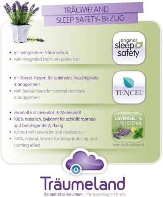 Der Bezug dieser Matratze besteht aus dem „sleep safety Multifunktionsstoff“, der mit dem sogenannten „Wash-Vlies“ versteppt ist. Insgesamt bietet dieser Bezug bestmöglichen Schutz gegen Nässe und eine gute Luftdurchlässigkeit zugleich. Gleichzeitig ist er mit natürlichem Lavendel- und Melisseöl veredelt, wodurch eine schlaffördernde und beruhigende Wirkung erzielt wird. Zusammen mit dem Vlies ergibt sich eine angenehme, kuschelige Liegefläche. Mittels Reißverschluss können Sie den Bezug zum Waschen abnehmen.