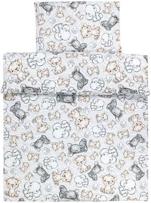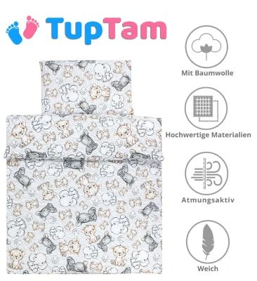Details:* FÜR GANZJÄHRIGEN GEBRAUCH – Das gemusterte Kinder Ganzjahresdecke Set aus Decke 135×100 und Flachkissen 40 x 60 – praktisches Accessoire für jedes Kinder- und Babybett!* ERHOLSAMER SCHLAF – Die formstabile, antiallergische Polyesterfüllung hält das Kind entsprechend warm, reguliert die Körpertemperatur und sorgt für optimale Luftzirkulation.* REINE BAUMWOLLE – Das hochwertige atmungsaktive Baumwollmaterial fühlt sich sanft auf sensible Kinder Haut an und bietet maximalen Komfort und Sicherheitsgefühl beim Schlafen.* PFLEGELEICHT – Das Bettdecke Set sollte in einer Waschmaschine bei maximal 40°C (Schonwaschgang) gewaschen werden. Nicht trocknergeeignet.* TOLLE MUSTER – Dank den schönen Designs mit Bären, Mond mit Elefant oder Safari müssen keine Bezüge auf das Bettdecken Set gelegt werden, was für Eltern viel Zeit erspart.* Material: Obermaterial: 100% Baumwolle; Füllung: 100% PolyesterDas zweiteilige weiche Kinder Bettdecken-Set von TupTam schafft optimalen gesunden Schlafkomfort und besticht durch seine coole Muster mit Tieren oder Sternen. Dank dem schön bedruckten Baumwolle-Stoff braucht man keine Bezüge auf das Bettdecken Set aufzuziehen. Eine enorme Zeitersparnis für Eltern! Das Ganzjahresdecke Set besteht aus Bettdecke 135 x 100 cm und Flachkissen 40 x 60 cm, die den Kinderkopf einer komfortablen optimalen Position hält und so für ein sicheres Schlafklima sorgt. Leichte, reine Baumwolle ist die ideale Wahl für empfindliche Babyhaut, die besondere Pflege braucht. Der atmungsaktive Stoff schmiegt sich angenehm auf der Haut und gibt Geborgenheitsgefühl für Kinder. Die antiallergische Füllung hält dagegen in den Wintertagen kuschelig warm und sorgt für entsprechende Luftzirkulation im Sommer. Eine praktische und zugleich wunderschöne Ergänzung für jedes Kinderbett! Hergestellt in der EU.