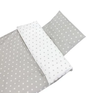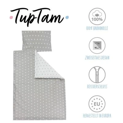 Details:* Kinder Bettgarnitur 2-tlg. Drei Sets stehen zur Auswahl: Set: 1 x Bettbezug 100 x 135 cm, 1 x Kissenbezug 40 x 60 cm, 1 x Bettbezug 120 x 90 cm, 1 x Kissenbezug 40 x 60 cm* Sowie Set: 1 x Bettbezug 135 x 200 cm, 1 x Kissenbezug 80 x 80 cm* Bettwäsche aus hautfreundlicher, reiner Baumwolle für gesundes Schlafklima. Bettbezug und Kissenbezug sind mit einem Reißverschluss versehen.* Modische Farb- und Mustervarianten: Autos (Blau, Grün), Elefant (Blau), Große Sterne und Kleine Sterne (Grau/Weiß), Herzen (Rosa, Minze), Kronen (Grau/Weiß, Blau/Weiß)* Pflegehinweise: Maschinenwäsche bei 40° C, Schonwaschgang* Material: 100% BaumwolleStilvolle Kinder Wendebettwäsche von TupTam! Der hochwertige Stoff aus reiner hautfreundlicher Baumwolle sorgt für gesundes Schlafklima und garantiert besten Schlafkomfort. Das 2 tlg. Kinderbettwäsche-Set ist in drei Größen erhältlich: Bettbezug 100 x 135 cm und 1 x Kissenbezug 40 x 60 cm, Bettbezug 120 x 90 cm und 1 x Kissenbezug 40 x 60 cm, Bettbezug 135 x 200 cm und 1 x Kissenbezug 80 x 80 cm. Die Bezüge sind mit verdecktem Reißverschluss am unteren Saum ausgestattet. Zur Auswahl stehen wunderschöne Farb- und Mustervarianten. Hergestellt in der EU mit viel Liebe zum Detail.