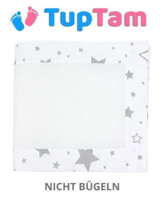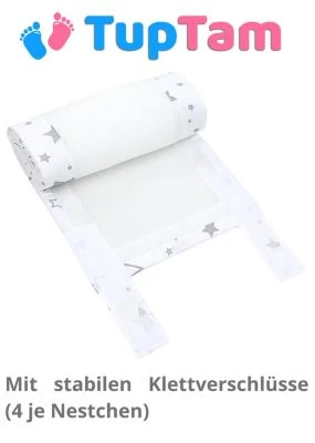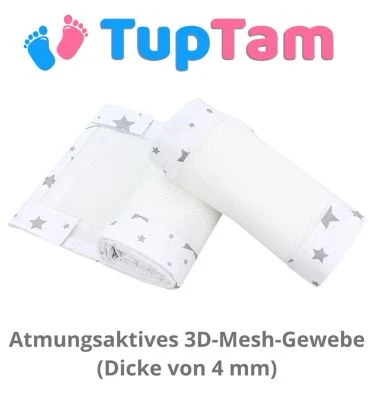 Details:* NESTCHEN FÜR BABYBETT – Dieses 2er Set Mesh-Nestchen für Neugeborene sorgt dafür, dass die Hände oder Füße Ihres Babys sich zwischen den Sprossen nicht einklemmen lassen* ATMUNGSAKTIVES MATERIAL- Der dünne maschinenwaschbare 3D-Mesh-Stoff mit einer Dicke von 4 mm schafft die entsprechende Luftzirkulation im Babybett.* NICHT BÜGELN – Bitte beachten Sie, dass das 3D Mesh Netz nicht gebügelt werden darf!* KINDERLEICHT ZU BEFESTIGEN – Dank der Klettverschlüsse kann das Nestschen schnell und mühelos am Kinderbett angebracht werden. Jedes Netschen hat 4 Klettverschlusse.* PRAKTISCHE GRÖßE – Die Bettumrandung 30 cm x 128 cm passt perfekt für das Babybett mit der Größe 140 × 70 cm. Jedes Set enthält zwei Bettumrandungen in modischem Design.* Material: Netz: 100% Polyester; Paspel: 100% BaumwolleDiese leichte Bettumrandung aus atmungsaktivem Mesh von TupTam schafft für Ihr Baby eine ruhige und angenehme Schlafumgebung. Dank des dünnen 3D-Netzgewebes gibt es eine optimale Luftzirkulation im Inneren des Bettchens, die für die Aufrechterhaltung der richtigen Körpertemperatur sorgt. Das Baby 3d Netz erfüllt auch eine Schutzfunktion. Es verhindert, dass die Hände und Füße Ihres Babys zwischen den Sprossen stecken bleiben. Mit stabilen Klettverschlüsse (4 je Nestchen) können die Eltern das Nestchen problemlos an Babybett-Gitterstäbe befestigen. Neben seinem praktischen Nutzen ist das Netz zudem eine schöne Dekoration für das Babyzimmer! Sie können zwischen dem Design mit einfarbiger Paspel in Rosa, Grau und Blau oder mit gemusterter Paspel mit Sterne, Hase/ Eule und Vogelbeere.