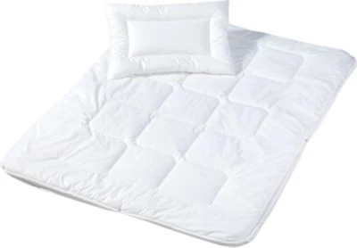 Beide Decken und das Kissen sind mit einer weichen silikonisierten Spiralpolyesterhohlfaser (HCS) gefüllt. Diese ist atmungsaktiv und feuchtigkeitsregulierend. Dank der Steppung wird ein Verrutschen der Füllung verhindert. Der Bezug ist kuschelig weich und fühlt sich sehr angenehm an, dank „Pfirsichhaut-Effekt“.